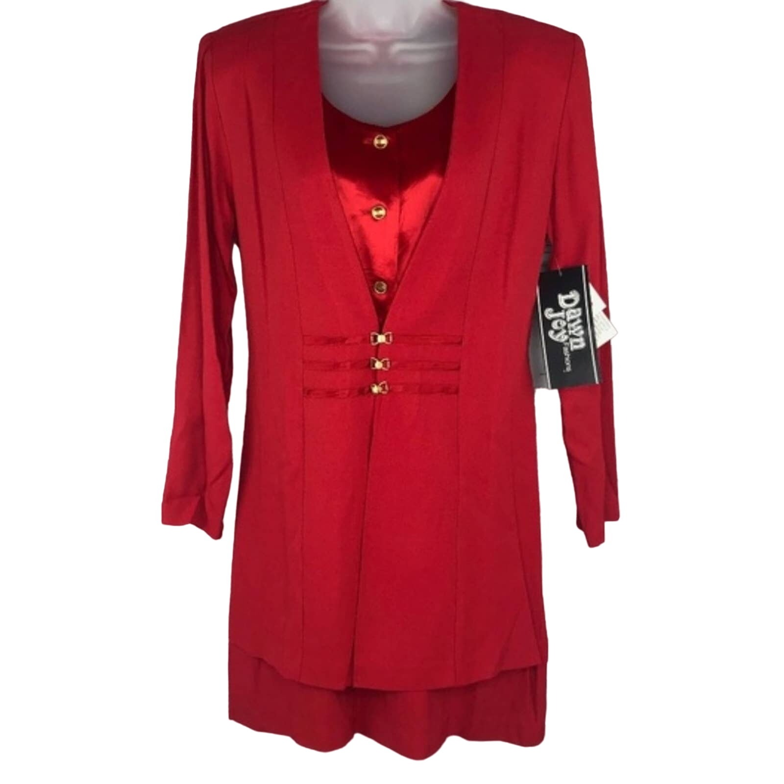 Vintage new with tags Dawn Joy Fashions red long sleeve dress. Layered look with a satin panel underneath and gold button and latch details down the front and at the waist. Ties at the back for a flattering fit. Has shoulder pads for structure. Size 7/8 or small-medium, see measurements! A couple of very minor pulls from storage (see last photo)